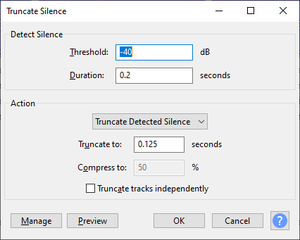 III – Effects -> Truncate Silence e configure assim -> OK